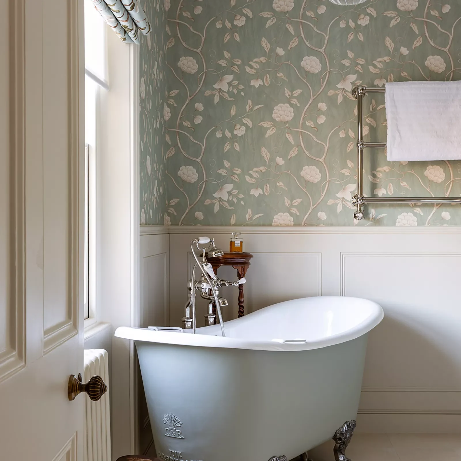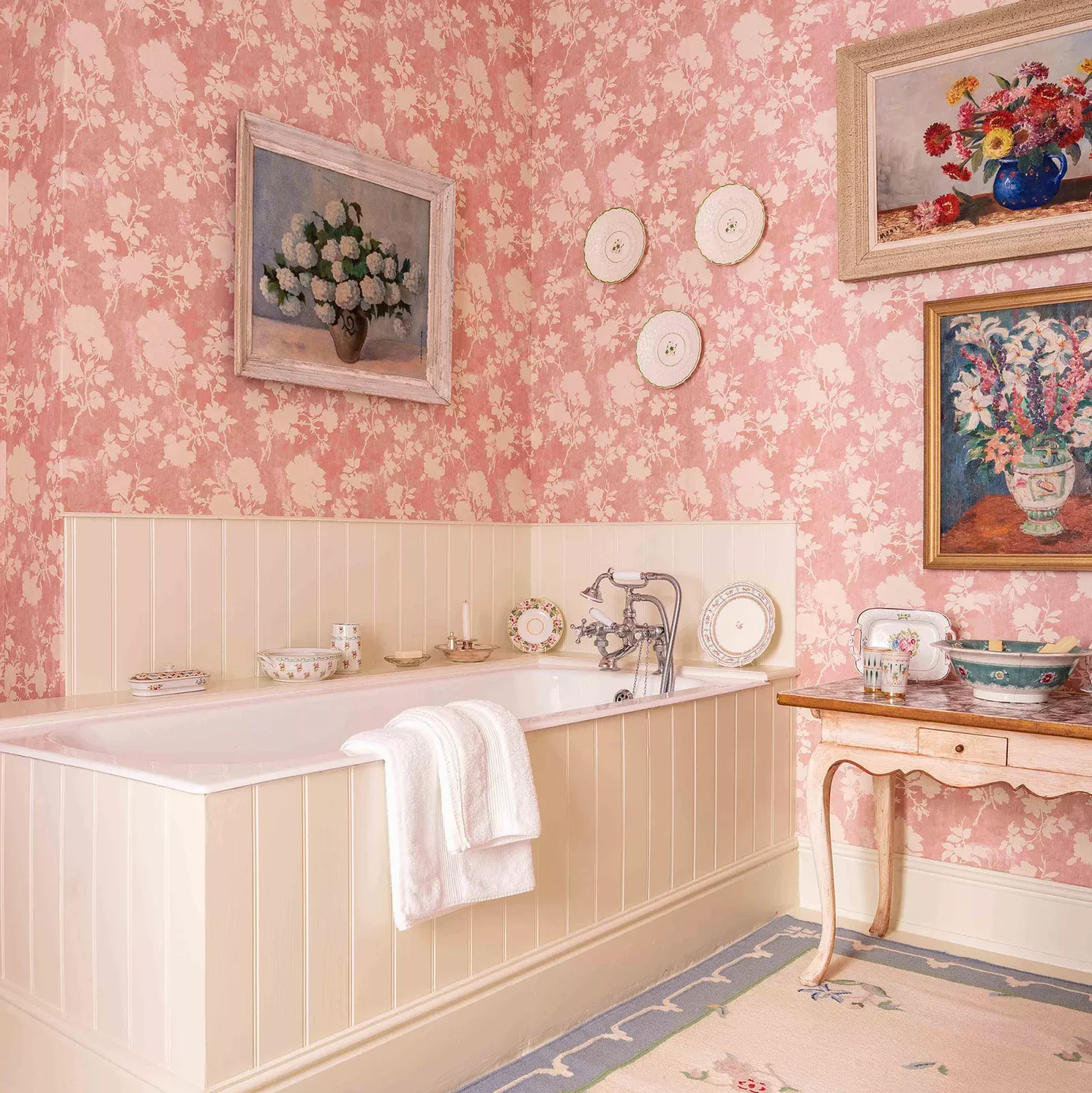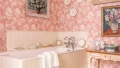 例えばお風呂場に布製のローマンシェードを使うなんて発想は当然日本人にはないのですが、イギリスではお風呂場に壁紙やカーペット、壁には絵を飾る、これが一般的なバスルームのインテリアです。