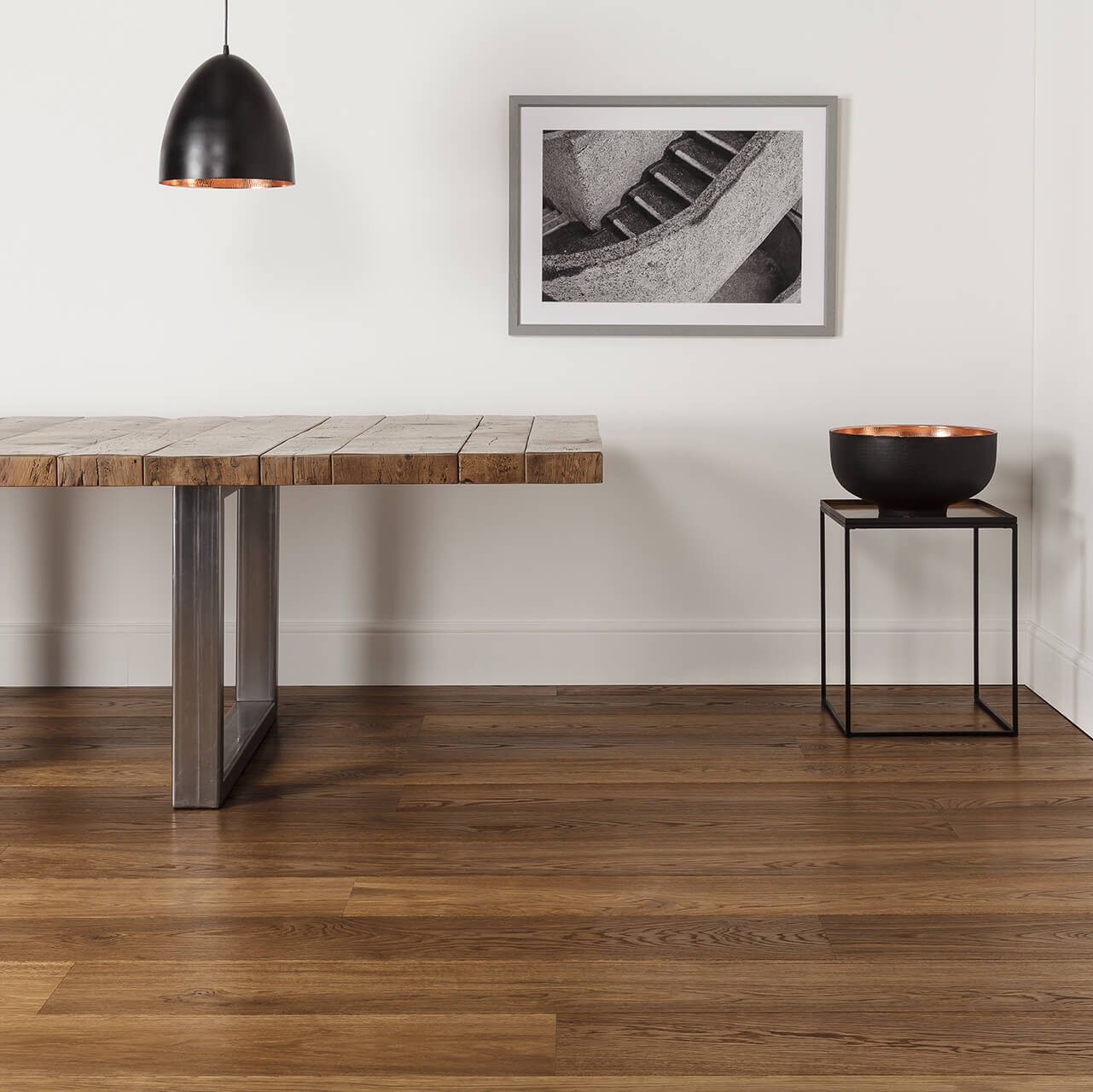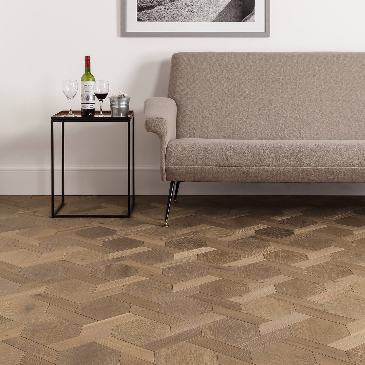 リビングルームは「リアルウッドの木材にこだわったフローリング」組子タイプのパーケットとストリップのデザインがあります。