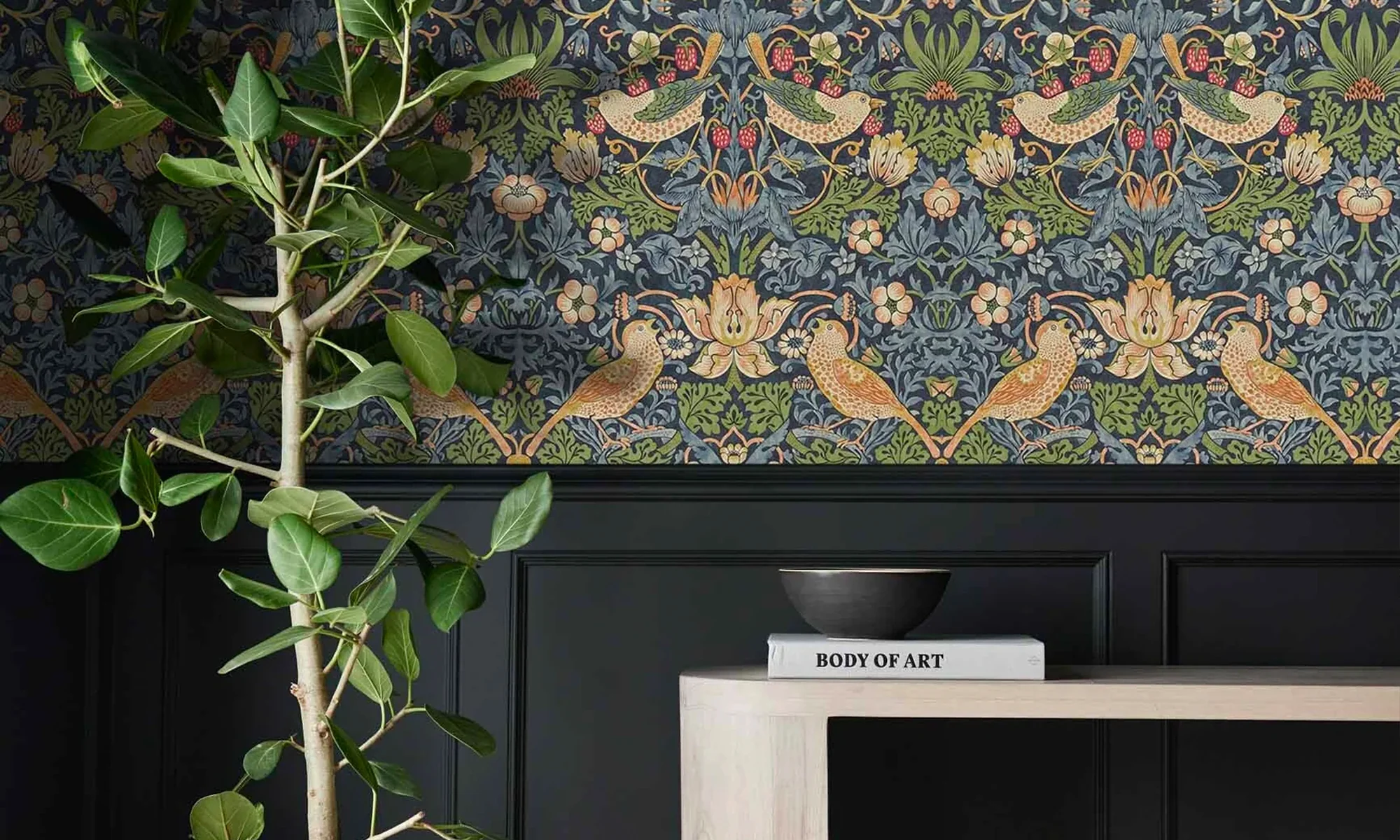 一つの壁だけにモリス柄の壁紙を使う方法。家具やフロアの色に合わせましょう。