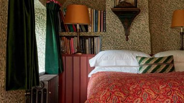 ウッドパネルとウィリアム・モリスの壁紙でつくるコテージコアなバスルームのカラースキームをご紹介。セージグリーンやブルーグレーの配色例、真鍮金具との合わせ方、英国風インテリアのポイントを解説します。